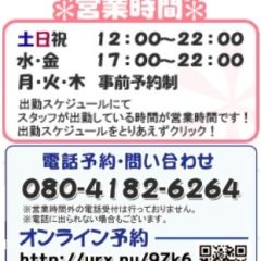 | 営業時間 | 水・金 17:00~22:00 土・日・祝 12:00~22:00 にて営業しています。 ですが、スタッフが出勤している時間帯のみしか営業していないため 出勤スケジュール http://egoiste.bambina.jp/mia/c_cms_csv/sch_top.php にて、スタッフの出勤状況を確認の上、ご来店ください。 なお、受付スタッフがいる時間帯は 水・金 17:00~22:00 土・日・祝 12:00~22:00 については、受付スタッフが常駐しており、原則営業しております。 ■スタッフの出勤スケジュール=営業日です!■ PC・スマホ → http://egoiste.bambina.jp/mia/c_cms_csv/sch_top.php 携帯 → http://egoiste.bambina.jp/mia/c_cms_csv/i/sch_top.php | ||||||||||||||