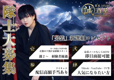 【男装募集】 誠酒屋の"新人隊士"を募集します🏯🌕 新撰組の和装を着て、いつもと違う自分にチャレンジしよう🇯🇵 【経験者優遇・🔰未経験者 大歓迎です!】 即日、面接OK👌ご応募、詳細はこちらから 👉 https://t.co/xbwZHPL2xP #秋葉原 #男装カフェ #誠酒屋 #男装バイト #コンカフェ求人 #TikTok https://t.co/Q9fBExTNBt