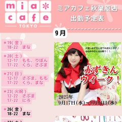 赤ずきんウィークinミアカフェ秋葉原店 2025年9月17日(水)~24日(水) 9月19日(金)  18-22 まな・初回勤務の新人さん 9月20日(土)  12-17 もも・りぼん  17-22 さぶま・くら 9月21日(日)  12-17 さぶま・もも  17-22 くら・まな 出勤一覧  https://t.co/inbQ85tzfB https://t.co/tDcSyyR3ho