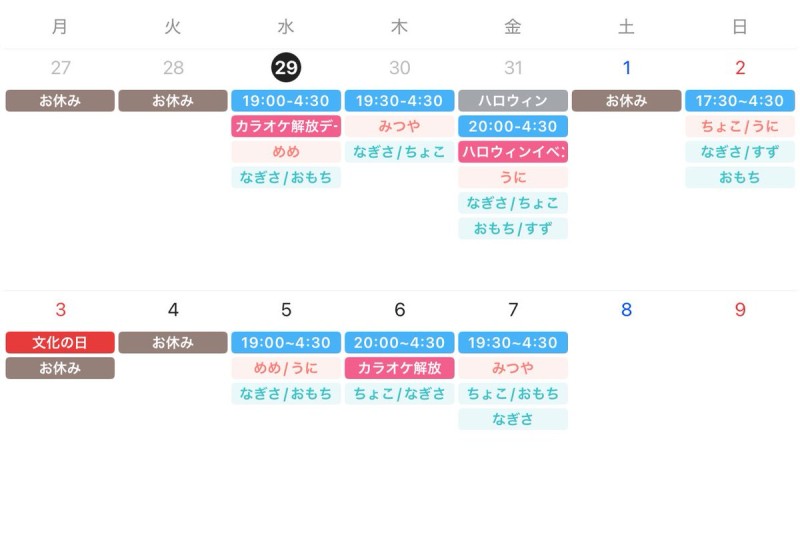 | 営業時間 | 月〜木18:00~23:30 金18:00~5:00 土17:00~5:00 日17:00~23:30 | ||||||||||||||