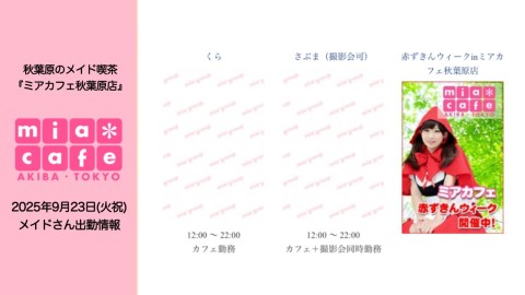 | å¶æ¥æé | âãã¢ã«ãã§æ±äº¬åºïŒã¡ã€ãã«ãã§ïŒhttp://www.mia-cafe.com/ãâ â¡å¹³æ¥ãæïœéãïŒïŒïŒïŒïŒïœïŒïŒïŒïŒïŒ â¡åæã»æ¥æã»ç¥æ¥ãïŒïŒïŒïŒïŒïœïŒïŒïŒïŒïŒ â å®äŒæ¥ããªãïŒ2019幎1æããå®äŒæ¥å»æ¢ïŒ â¡ã©ã¹ããªãŒããŒãéåºã®ïŒïŒåå ãïŒïŒïŒïŒïŒéåºã®å ŽåâïŒïŒïŒïŒïŒã©ã¹ããªãŒããŒ å¶æ¥æ¥ãåºå€ç¶æ³ã«ã€ããŠã¯ãã¡ãã http://pandaland.cutegirl.jp/mif/c_cms_csv/sch_top.php âãã¢ãªã©ïŒãã©ãæ±äº¬åºïŒæ®åœ±äŒïŒãªãã¬ïŒhttp://www.mif-lr.com/ãâ â¡å šæ¥ãïŒïŒïŒïŒïŒãïŒïŒïŒïŒïŒãã§ãããªã©ã¯ãŒãŒã·ã§ã³åºå€ã¹ã¿ãããããæé垯ã®ã¿å¶æ¥ã§ãã â å®äŒæ¥ã¯äžå®äŒïŒåºå€ã¹ã¿ãããããæé垯ã®å¶æ¥ïŒ â¡æçµåä»ãéåºã®ïŒïŒåå ãïŒïŒïŒïŒïŒéåºã®å ŽåâïŒïŒïŒïŒïŒïŒïŒïŒïŒïŒïŒè¿ã«æœè¡æéãçµããã³ãŒã¹ïŒ â»é«æ ¡çäžå¯ âæ·±å€å¶æ¥ã«ã€ããŠã¯ãå ¬åŒãµã€ãå³äžã® http://market.chu.jp/schedule1/sche37.cgi ãã¢ã°ã«ãŒãç·åã¹ã±ãžã¥ãŒã«ïŒïŒ°ïŒ£ã»ã¹ããïŒ http://market.chu.jp/schedule1/sche37.cgi?dm=1 ãã¢ã°ã«ãŒãç·åã¹ã±ãžã¥ãŒã«ïŒã¬ã©æºåž¯ïŒ ãã芧ãã ãããåç¥æ¥ã®ã¿å¶æ¥ãšãªããŸããåç¥æ¥ä»¥å€ã¯æ·±å€å¶æ¥ããããŠãããŸããã æ·±å€å¶æ¥å¯Ÿè±¡æ¥ãïŒïŒïŒïŒïŒãç¿æïŒïŒïŒïŒïŒïŒ¬ïŒïŒ¯ïŒïŒïŒïŒïŒïŒ | ||||||||||||||