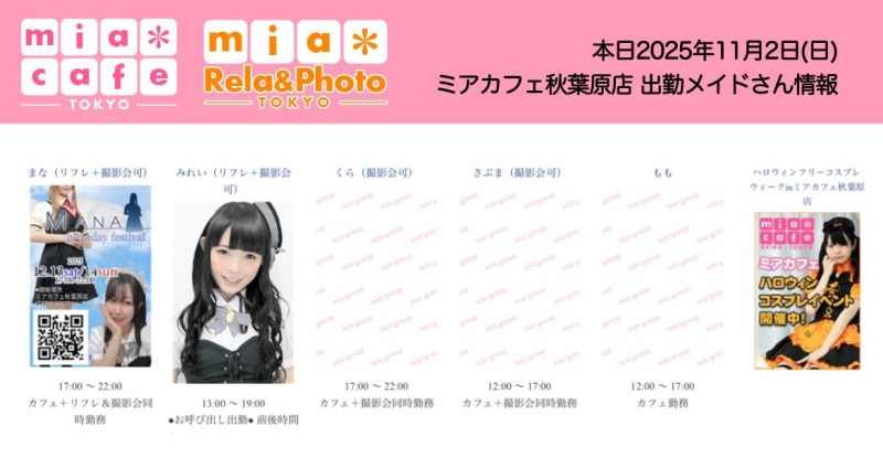 | å¶æ¥æé | âãã¢ã«ãã§æ±äº¬åºïŒã¡ã€ãã«ãã§ïŒhttp://www.mia-cafe.com/ãâ â¡å¹³æ¥ãæïœéãïŒïŒïŒïŒïŒïœïŒïŒïŒïŒïŒ â¡åæã»æ¥æã»ç¥æ¥ãïŒïŒïŒïŒïŒïœïŒïŒïŒïŒïŒ â å®äŒæ¥ããªãïŒ2019幎1æããå®äŒæ¥å»æ¢ïŒ â¡ã©ã¹ããªãŒããŒãéåºã®ïŒïŒåå ãïŒïŒïŒïŒïŒéåºã®å ŽåâïŒïŒïŒïŒïŒã©ã¹ããªãŒããŒ å¶æ¥æ¥ãåºå€ç¶æ³ã«ã€ããŠã¯ãã¡ãã http://pandaland.cutegirl.jp/mif/c_cms_csv/sch_top.php âãã¢ãªã©ïŒãã©ãæ±äº¬åºïŒæ®åœ±äŒïŒãªãã¬ïŒhttp://www.mif-lr.com/ãâ â¡å šæ¥ãïŒïŒïŒïŒïŒãïŒïŒïŒïŒïŒãã§ãããªã©ã¯ãŒãŒã·ã§ã³åºå€ã¹ã¿ãããããæé垯ã®ã¿å¶æ¥ã§ãã â å®äŒæ¥ã¯äžå®äŒïŒåºå€ã¹ã¿ãããããæé垯ã®å¶æ¥ïŒ â¡æçµåä»ãéåºã®ïŒïŒåå ãïŒïŒïŒïŒïŒéåºã®å ŽåâïŒïŒïŒïŒïŒïŒïŒïŒïŒïŒïŒè¿ã«æœè¡æéãçµããã³ãŒã¹ïŒ â»é«æ ¡çäžå¯ âæ·±å€å¶æ¥ã«ã€ããŠã¯ãå ¬åŒãµã€ãå³äžã® http://market.chu.jp/schedule1/sche37.cgi ãã¢ã°ã«ãŒãç·åã¹ã±ãžã¥ãŒã«ïŒïŒ°ïŒ£ã»ã¹ããïŒ http://market.chu.jp/schedule1/sche37.cgi?dm=1 ãã¢ã°ã«ãŒãç·åã¹ã±ãžã¥ãŒã«ïŒã¬ã©æºåž¯ïŒ ãã芧ãã ãããåç¥æ¥ã®ã¿å¶æ¥ãšãªããŸããåç¥æ¥ä»¥å€ã¯æ·±å€å¶æ¥ããããŠãããŸããã æ·±å€å¶æ¥å¯Ÿè±¡æ¥ãïŒïŒïŒïŒïŒãç¿æïŒïŒïŒïŒïŒïŒ¬ïŒïŒ¯ïŒïŒïŒïŒïŒïŒ | ||||||||||||||