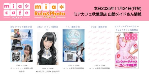 ★メイドカフェ・ミアカフェ #秋葉原 店★ ☕️営業予定日☕️ 🎀11月15日(土)  12-17 くら  17-22 にろ,まな 🎀11月16日(日)  12-17 もこちゃ,りぼん  17-22 くら,まな 🩺ピンクソーダ #ナース ウィーク🩺 💗11月22日(土)  12-17 有栖川でる【初お給仕】,まな  17-22 にろ,くら #看護婦 https://t.co/wn7YZPv1Sy